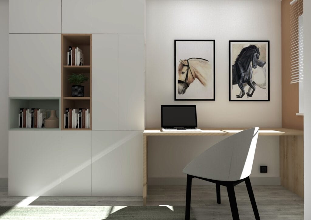 Projekt obejmuje powierzchnie piętnastu metrów kwadratowych usytuowanych na piętrze wraz ze skosem na jednej ze ścian. Motywem przewodnim są konie- największa miłość i pasja naszej klientki.