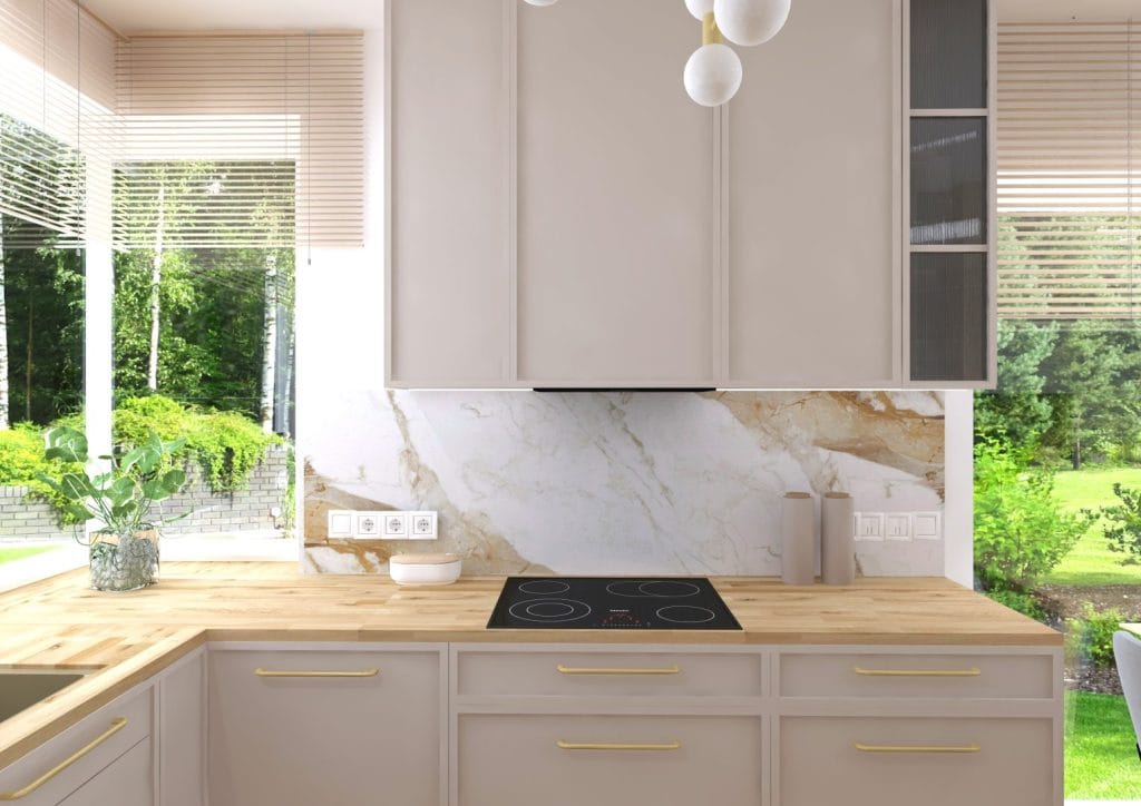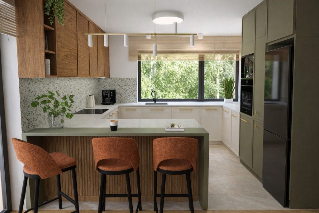 Cały parter to koncept, w którym współgrają harmonia barw, funkcjonalność i wyrafinowany minimalizm. Projekt udanie łączy neutralne tło z energetyzującymi akcentami – zielenią i złotem. Dzięki temu wnętrze zyskuje zarówno nowoczesny, jak i ciepły charakter, sprzyjający relaksowi i codziennej wygodzie.