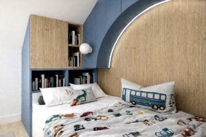 Poddasze o powierzchni ok. 85 m² zostało zaprojektowane od podstaw – pierwotnie była to całkowicie otwarta przestrzeń z bardzo niską wysokością i ostrymi skosami. Kluczowym założeniem projektu było funkcjonalne podzielenie wnętrza na nowe strefy przy jednoczesnym zachowaniu lekkości i spójności.