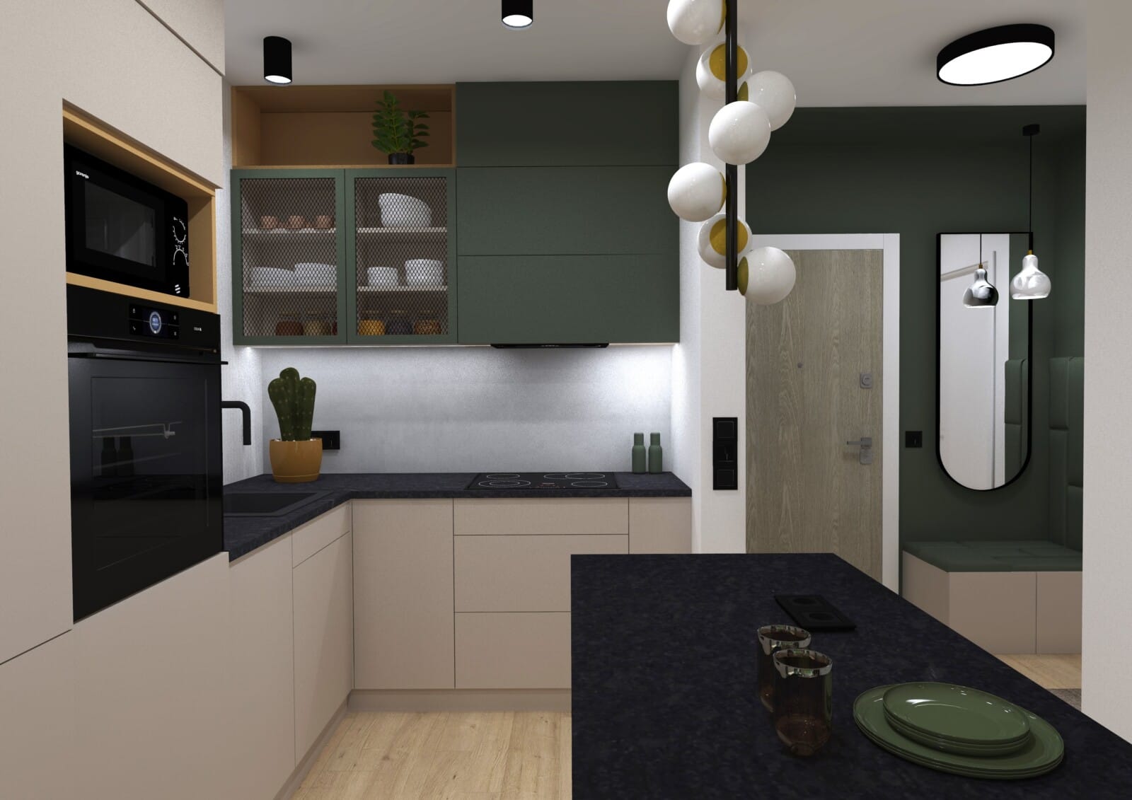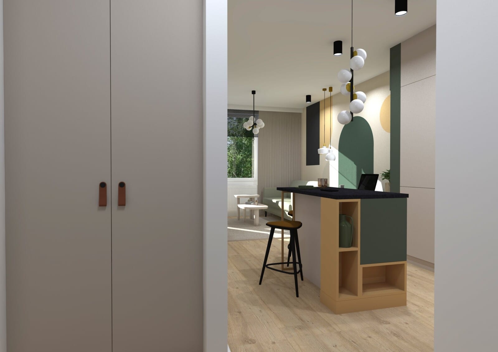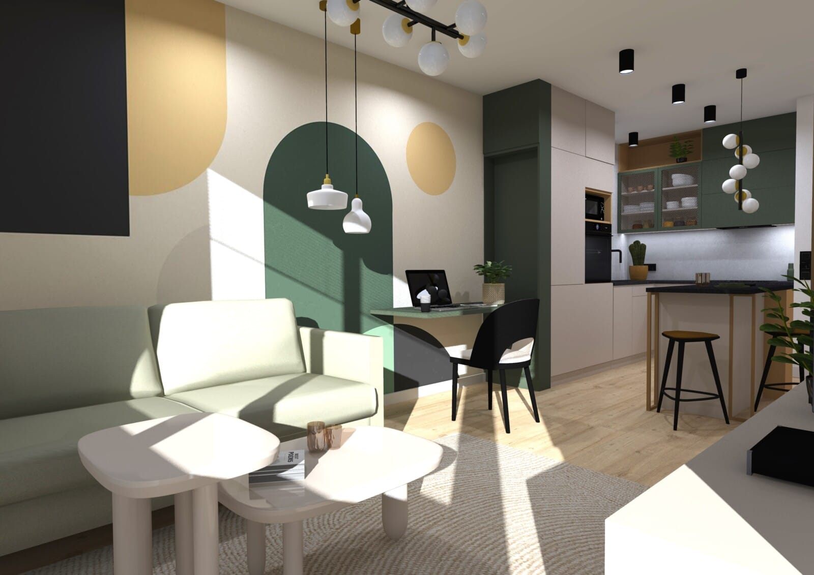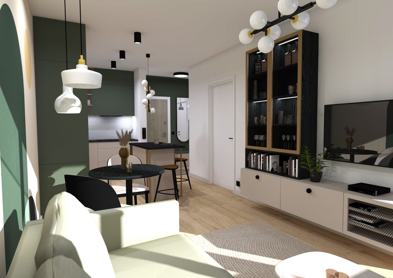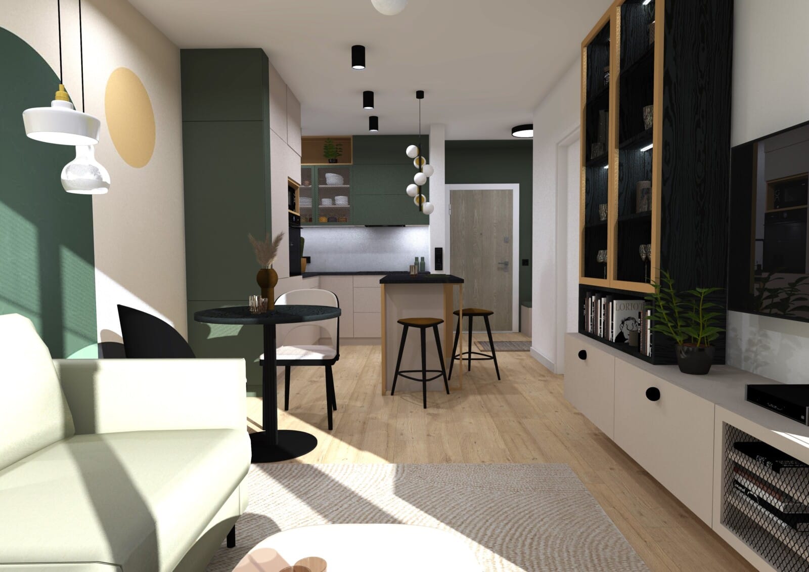 Projekt apartamentu w Krakowie to przestrzeń dla młodej, zapracowanej pary. To prawie czterdziesto metrowe miejsce do odpoczynku, a w razie potrzeby również do pracy zdalnej z wydzielonymi do tego przestrzeniami w oddzielnych pomieszczeniach. Kolorami dominującymi jest zieleń i odcień musztardowy z dodatkiem czerni.