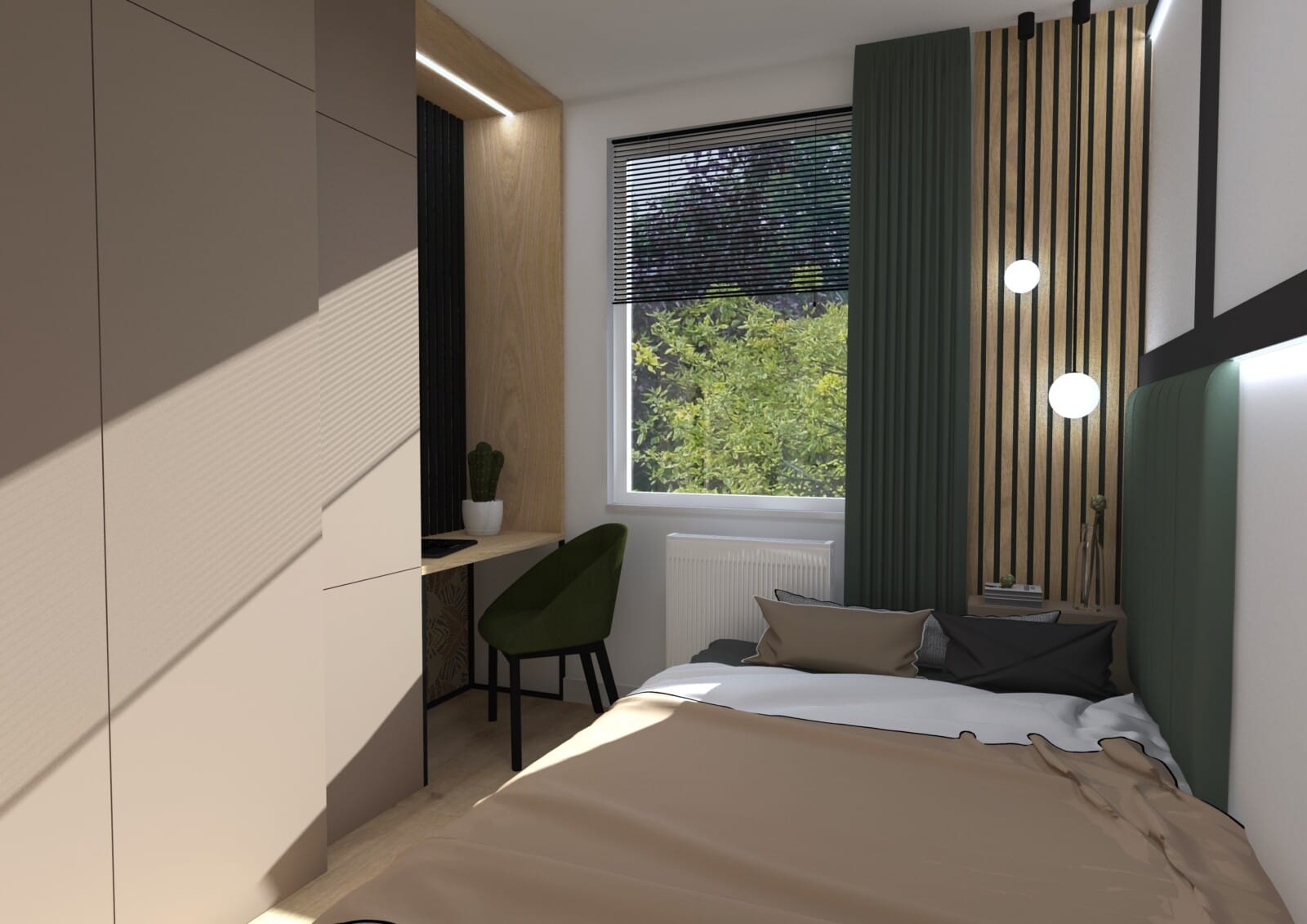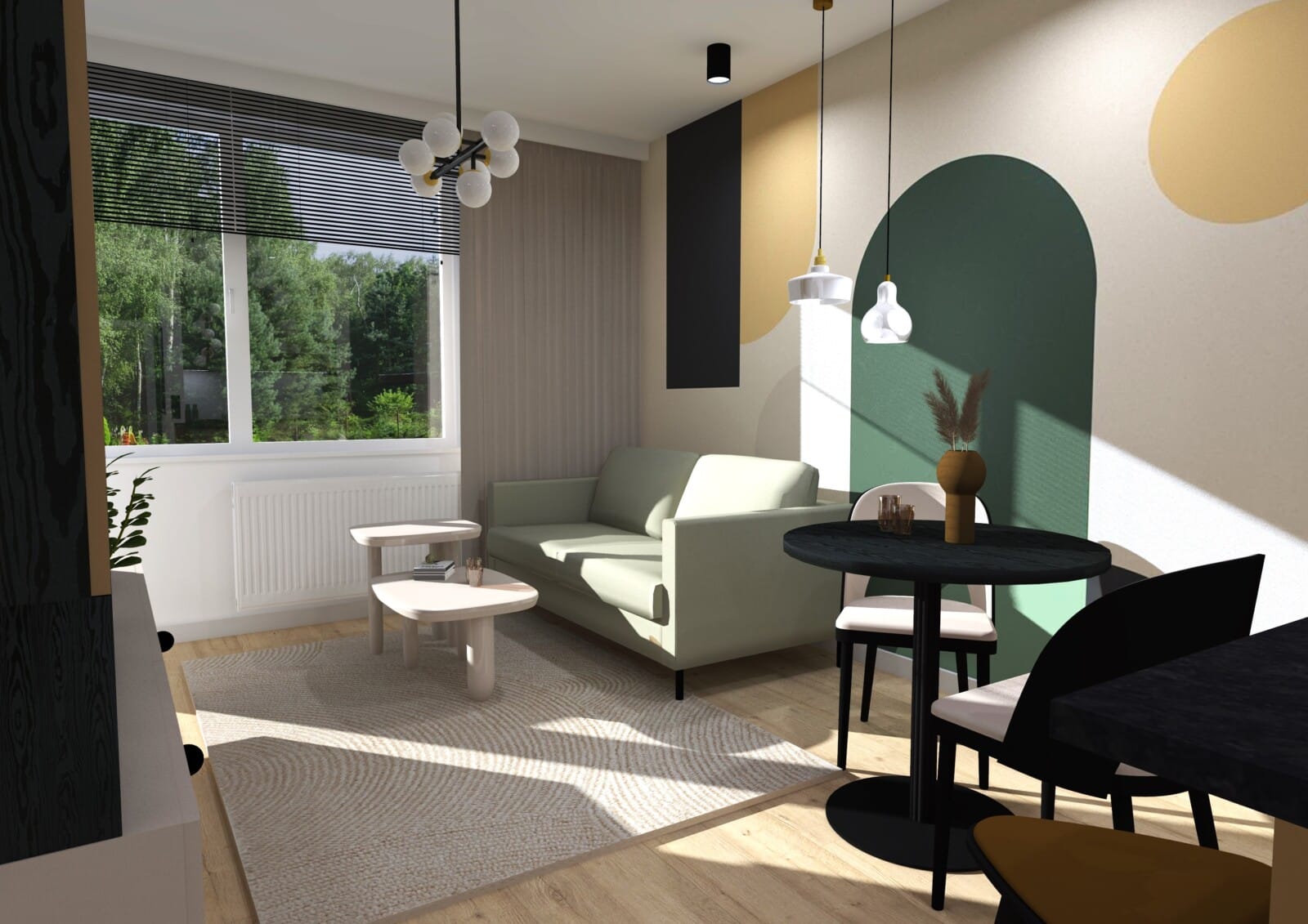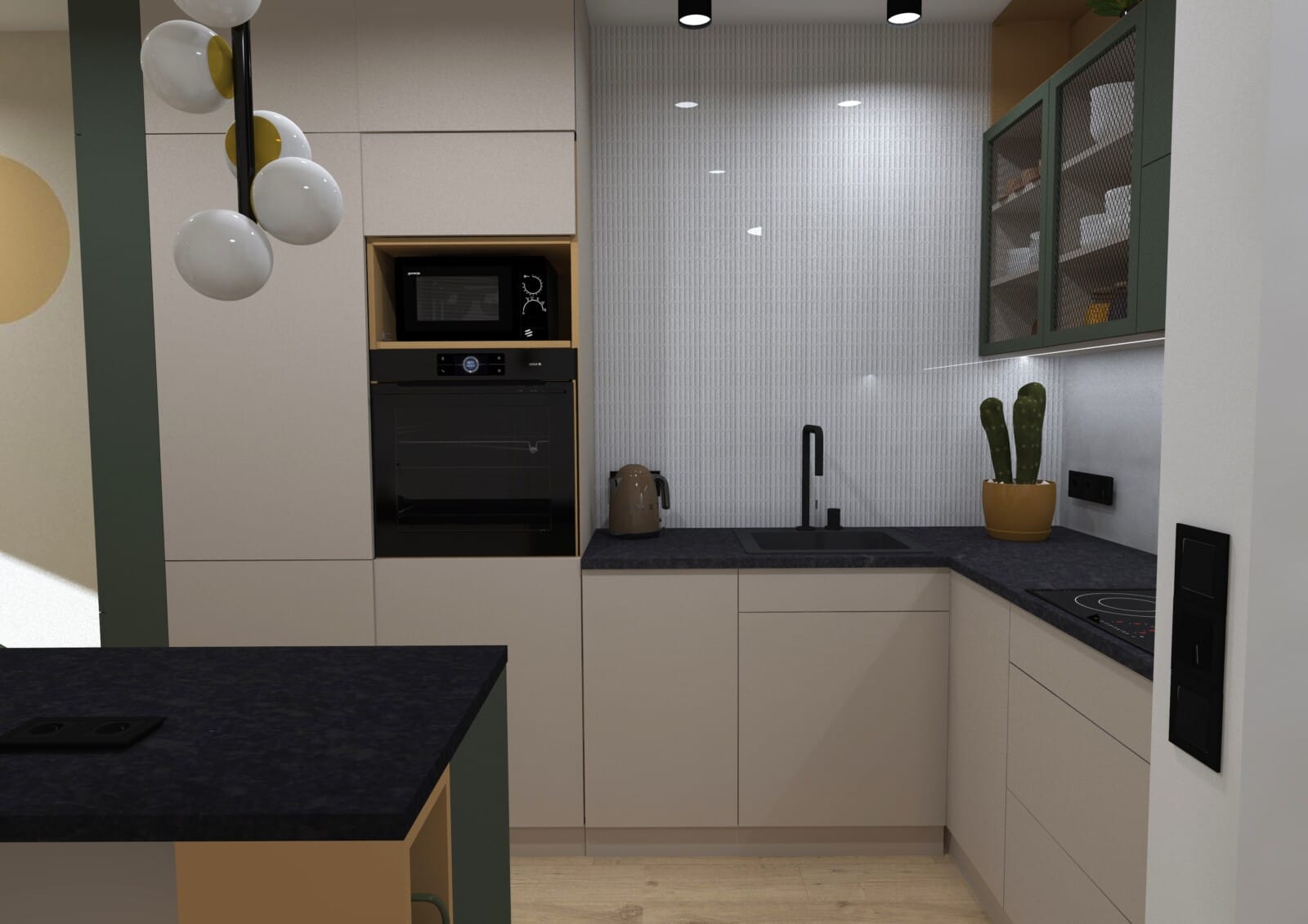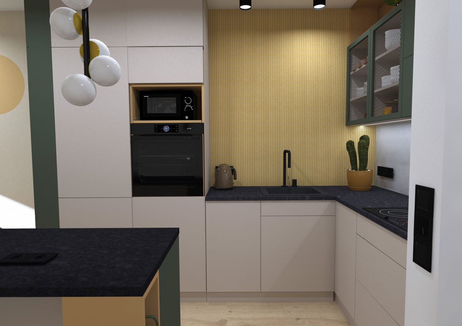 Projekt apartamentu w Krakowie to przestrzeń dla młodej, zapracowanej pary. To prawie czterdziesto metrowe miejsce do odpoczynku, a w razie potrzeby również do pracy zdalnej z wydzielonymi do tego przestrzeniami w oddzielnych pomieszczeniach. Kolorami dominującymi jest zieleń i odcień musztardowy z dodatkiem czerni.