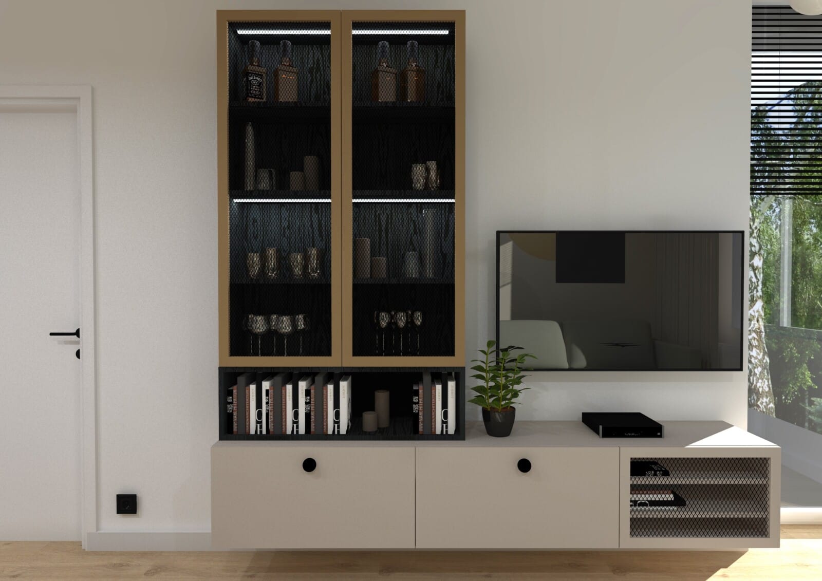 Mimo prostej formy, we wnętrzu motywem przewodnim są półkola i zaoblenia. Głównym elementem salonu jest zabudowa TV, która dodatkowo spełnia funkcję barku. Wykonana z czarnego forniru z charakterystyczną stalową siatką oraz z dodatkowym podświetleniem w środku wprowadza nutę industrialu do wnętrza.