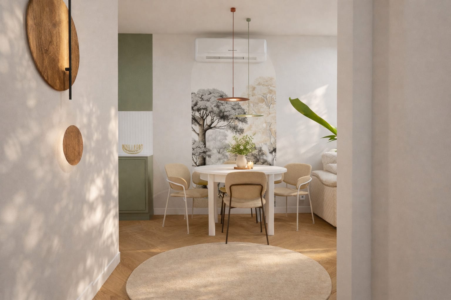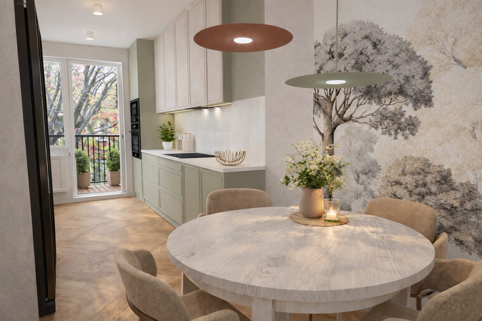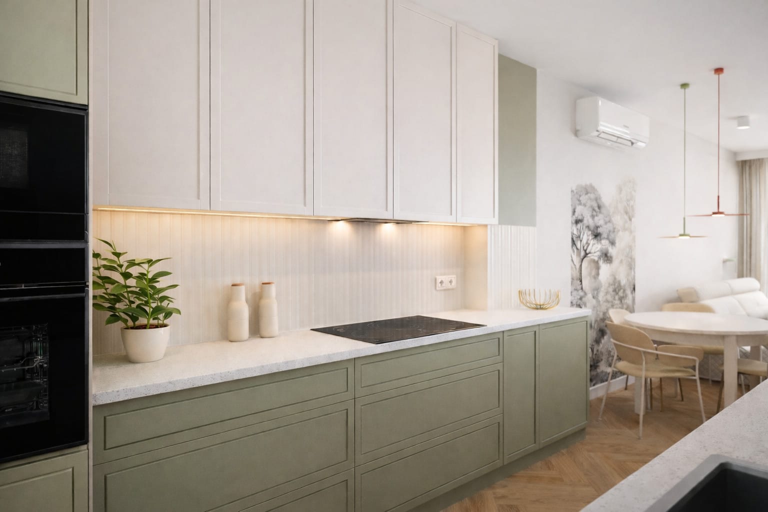 Strefa dzienna to harmonijne połączenie kuchni, jadalni i salonu. Zabudowa kuchenna została zaprojektowana w sposób minimalistyczny, z wyraźnym podziałem na lekką, jasną górę i bardziej wyrazisty, zielony dół. Delikatne podświetlenia LED podkreślają rytm pionowych struktur i nadają wnętrzu elegancji. W jadalni centralnym punktem jest okrągły stół sprzyjający integracji, a dekoracyjna ściana z motywem drzew wprowadza miękkość i artystyczny akcent.
