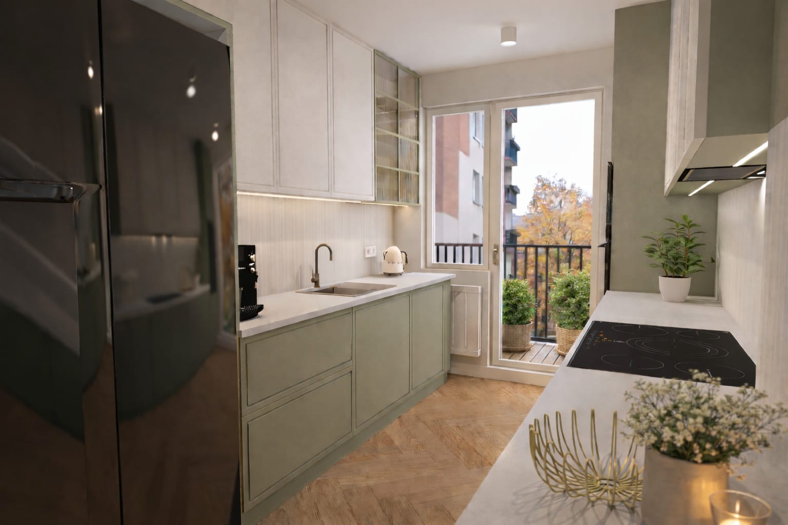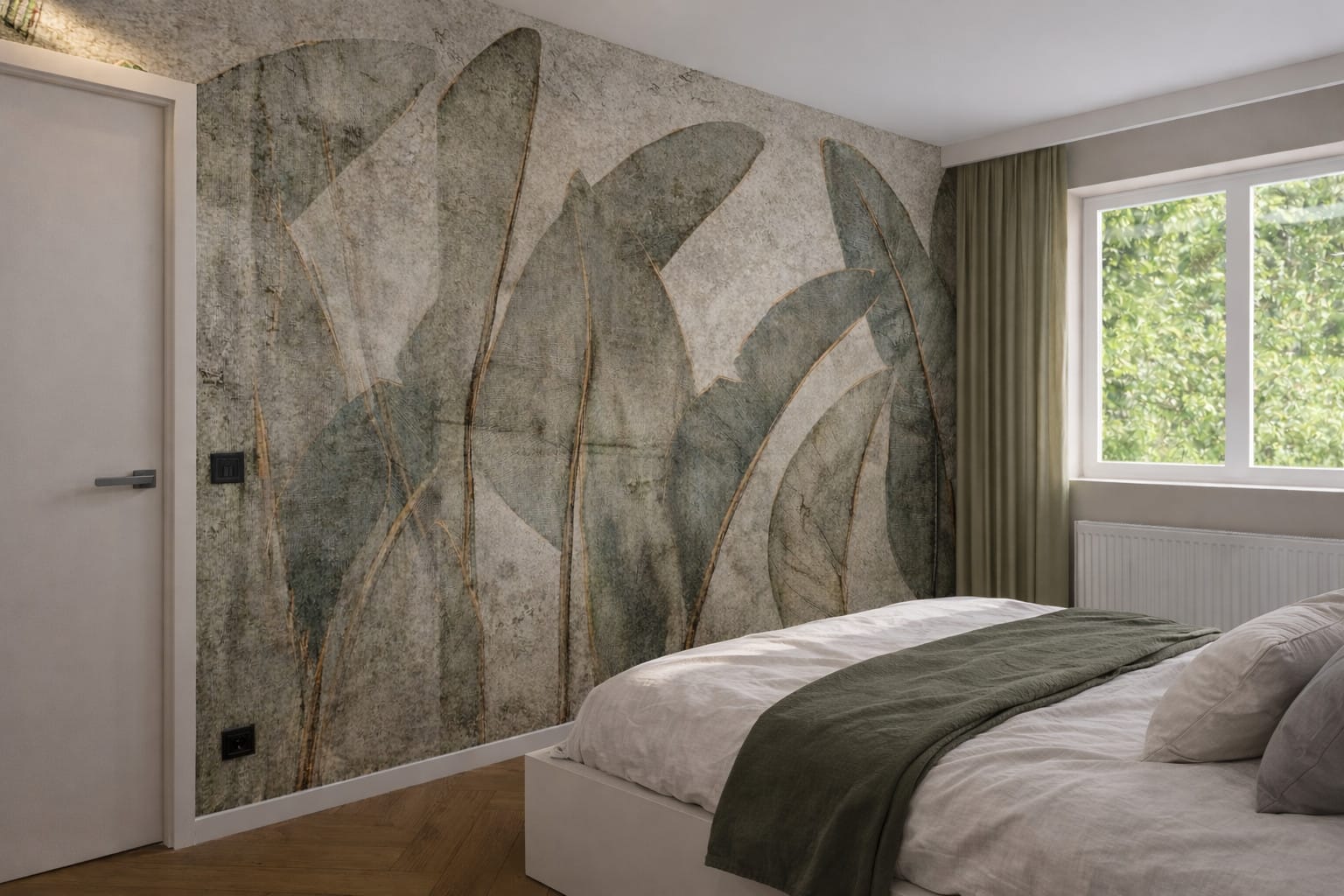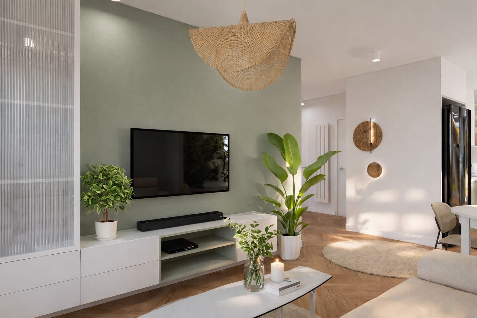Projekt opiera się na spokojnej, naturalnej palecie kolorystycznej. Dominują odcienie ciepłej bieli, beżu i złamanej szarości, uzupełnione subtelną zielenią w różnych tonacjach – od oliwkowych frontów kuchennych po głębsze akcenty w salonie i sypialni. Całość została ocieplona naturalnym rysunkiem drewna w jodełce, który pojawia się konsekwentnie we wszystkich pomieszczeniach, budując spójność wizualną.