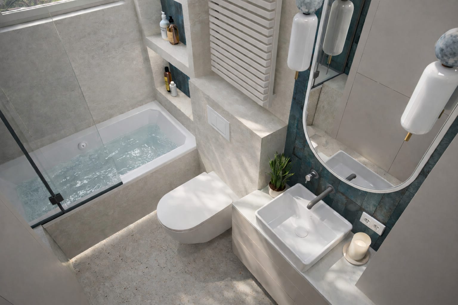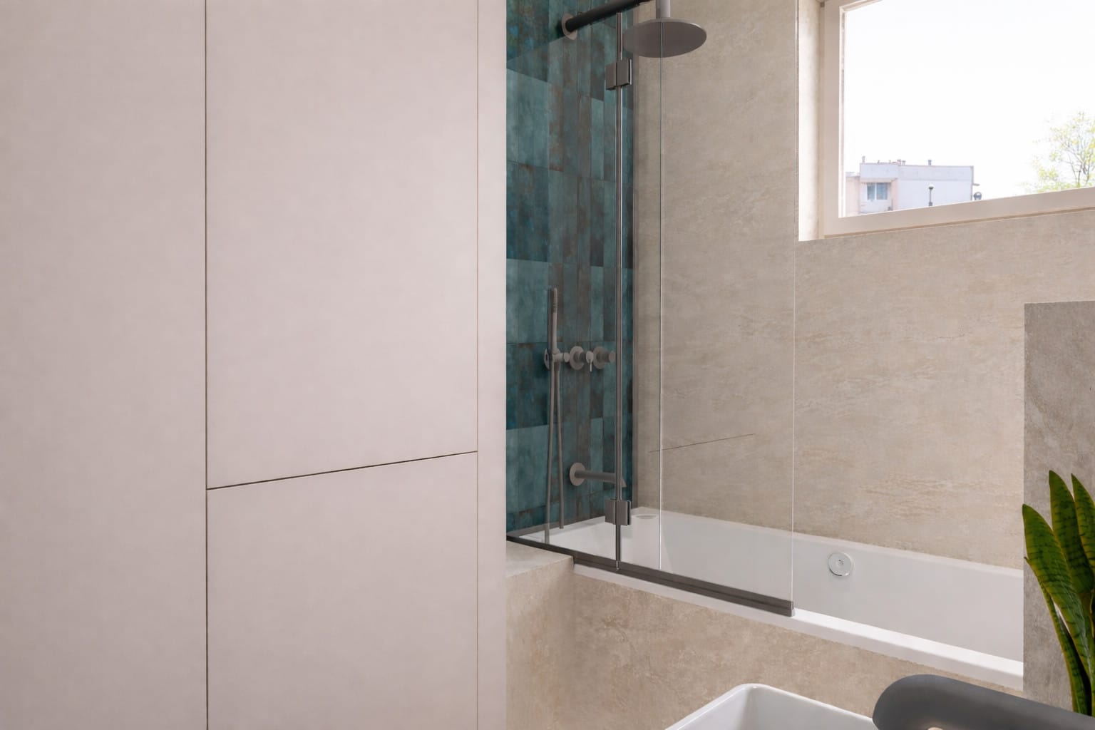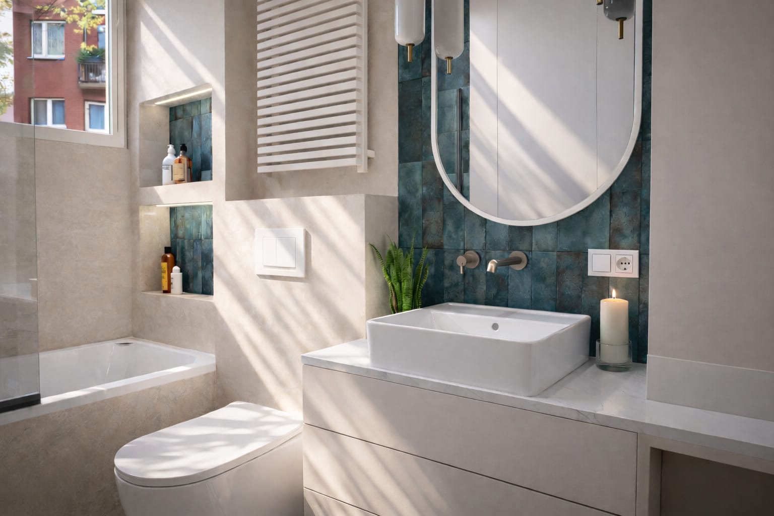 Łazienka została zaprojektowana jako spokojna, relaksująca przestrzeń. Jasne, kamienne powierzchnie zestawiono z wyrazistym, zielono-niebieskim akcentem płytek, co nadaje wnętrzu głębi. Zabudowy wnękowe zwiększają funkcjonalność, a odpowiednio zaplanowane oświetlenie – zarówno ogólne, jak i dekoracyjne – podkreśla strukturę materiałów.