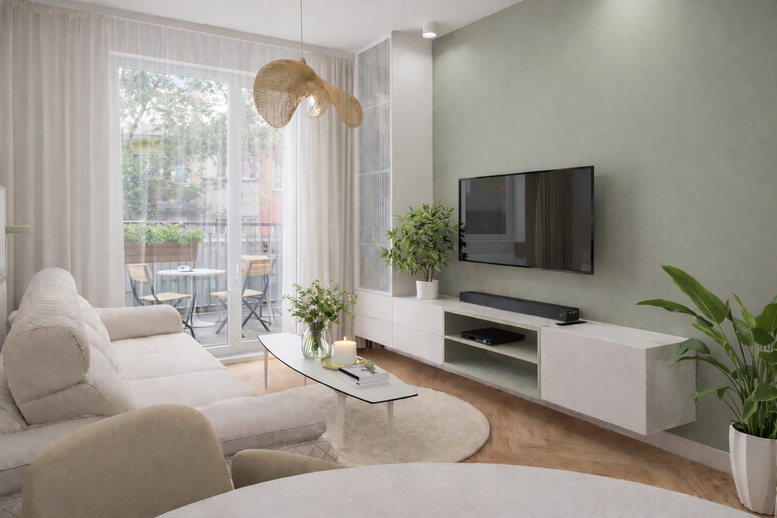 Salon utrzymany jest w lekkim, przytulnym charakterze – miękkie tkaniny, jasna sofa i naturalne dodatki współgrają z zieloną ścianą RTV oraz roślinnością. Duże przeszklenia zapewniają dostęp do światła dziennego, które buduje atmosferę wnętrza i podkreśla jego naturalny charakter.