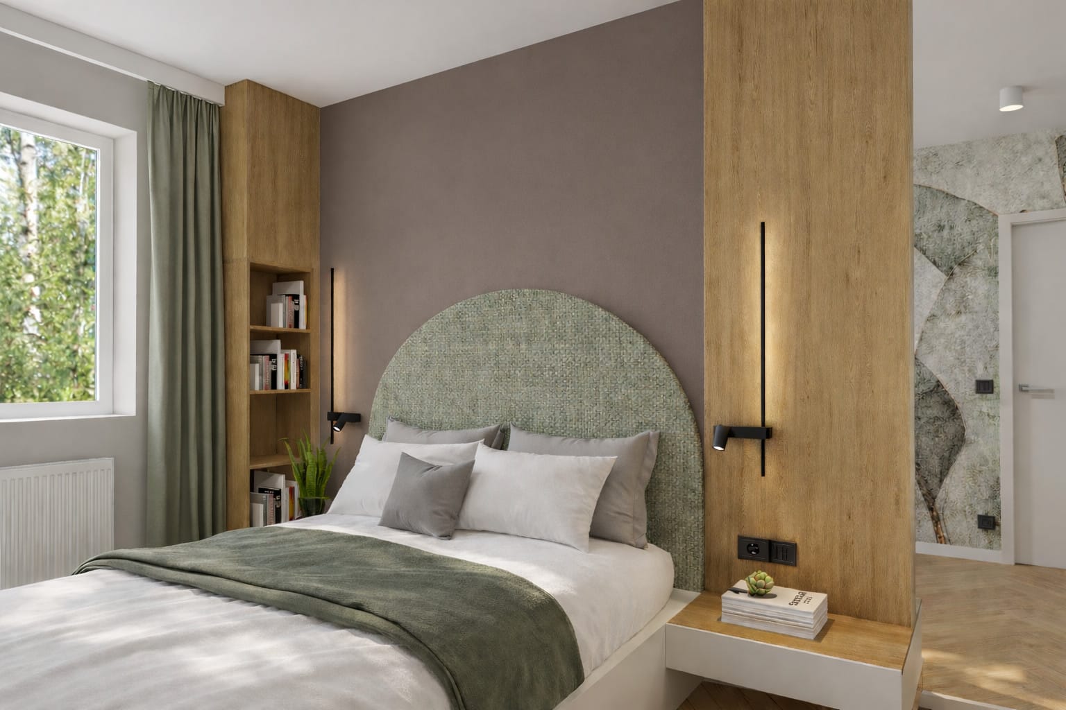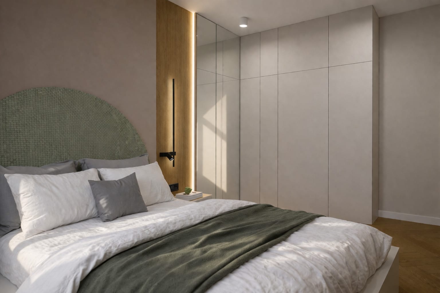 Sypialnia to najbardziej intymna część mieszkania. Tu dominują miękkie formy i stonowane kolory, które sprzyjają wyciszeniu. Tapicerowany zagłówek, tekstylia i ciepłe światło budują atmosferę komfortu, a zabudowy stolarskie zapewniają odpowiednią ilość miejsca do przechowywania bez zaburzania estetyki wnętrza.