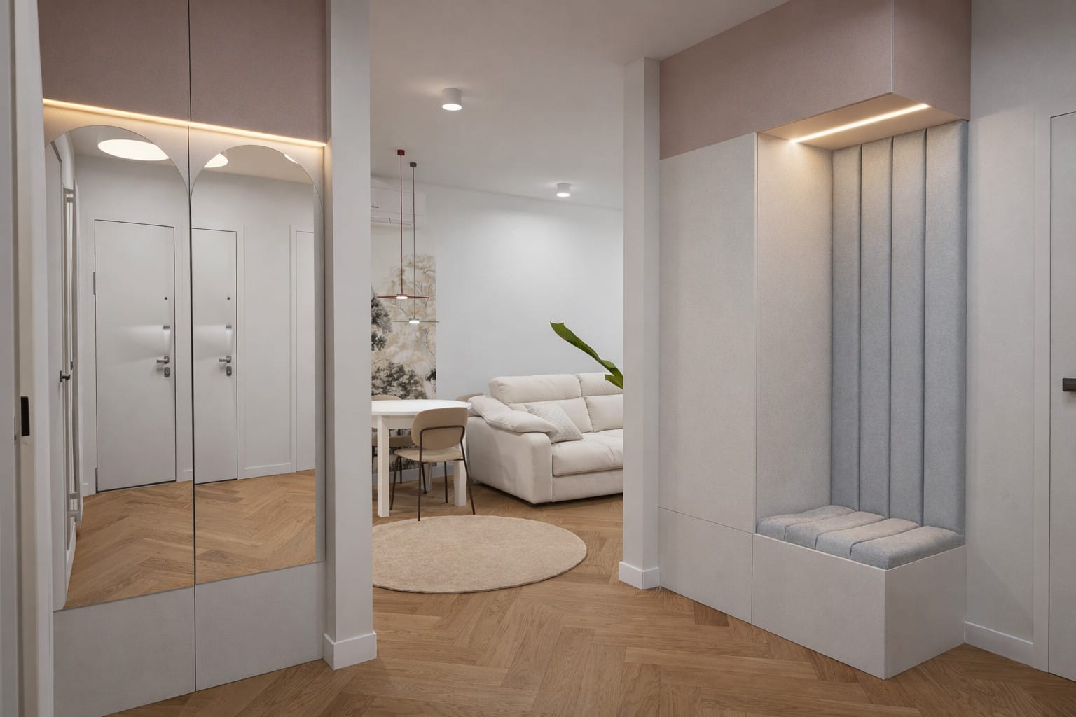 Jednocześnie układ mieszkania został zoptymalizowany – dodatkowy pokój został częściowo zredukowany na rzecz większego, wygodnego wiatrołapu z pojemną zabudową. Dzięki temu już od wejścia wnętrze oferuje porządek, funkcjonalność i czytelny podział stref.